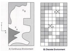En la forma de interpretar el entorno de un juego intervienen ciertas propiedades de este así como las dimensiones (2d o 3d) o su precisión. Para definir la precisión existen dos formas, la discreta (definida en un grid dividido por celdas (derecha)) y la continua (definida por coordenadas (izquierda)). Otra propiedad que delimita un juego es el tiempo, el momento en que una acción puede ocurrir, que en la misma forma que el espacio este puede ser clasificado como continuo o discretos (donde se analizan las acciones acciones por rangos de tiempo).