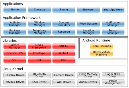 • El motor de Android, compuesto básicamente por la Dalvik VM, esta es una versión de Java optimizada para móviles diseñada por Google. Esta corre archivos .dex en vez de .jar, pero a su vez también hace uso de algunas librerías de Java. Una comparación con Java es que: