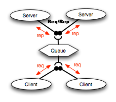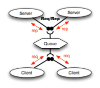 Para poder llevarlo a cabo se utilizan dos nuevos tipos de sockets zmq.ROUTER y zmq.DEALER en el nodo queue. El socket ROUTER recibe un mensaje de una conexión REQ y añade un ID al inicio de dicho paquete, luego es enviado por el DEALER. El DEALER escoge una conexión REP y lo envía, cuando este es procesado es devuelto otra al ROUTER y enviado al socket REQ que inició la conexión. Todo esto es posible (y rompe el patrón REQ\REP) mediante el ID que el ROUTER inserta.