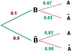 • P(overline{B}|A) = {(0.9 · 0.02)} / {0.1 · 0.97 + 0.9 · 0.02} = 0.157